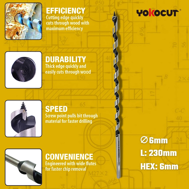 YOKOCUT Auger Drill Bit For Wood, Hex Shank Ship Auger Long Drill Bit For Soft & Hard Wood, Plastic, Drywall (6mm x 230mm)
