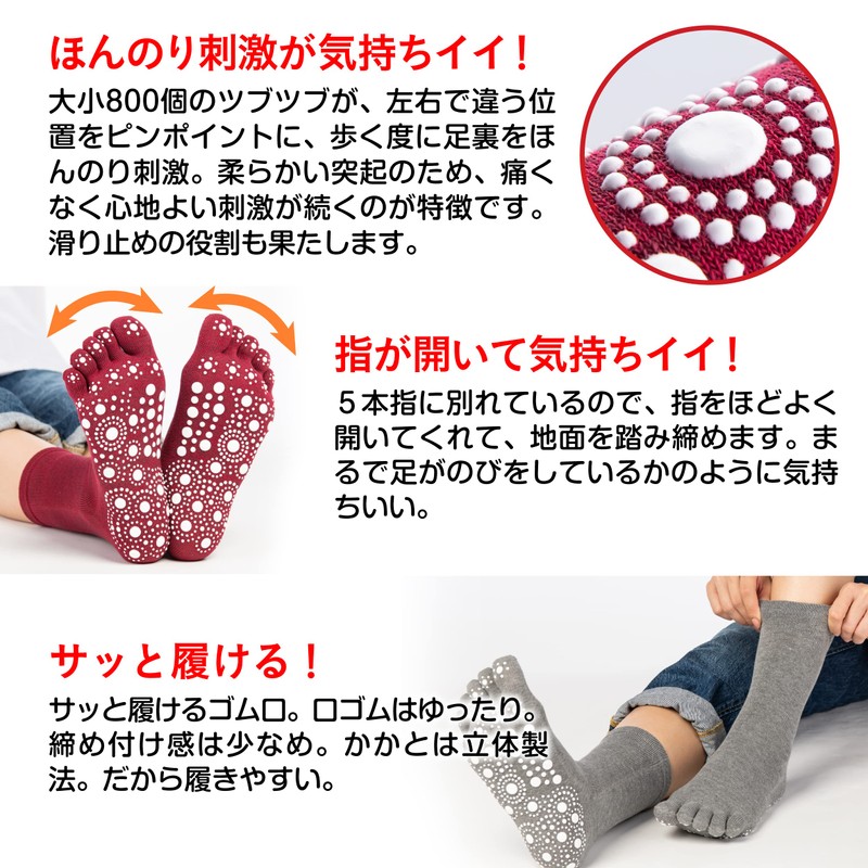 - Just put on and walk the secret is about 800 points of pressure points that are slightly stimulated to the soles of your feet. You can feel refreshed with a massage feeling. Five fingers for a comfortable feeling of release