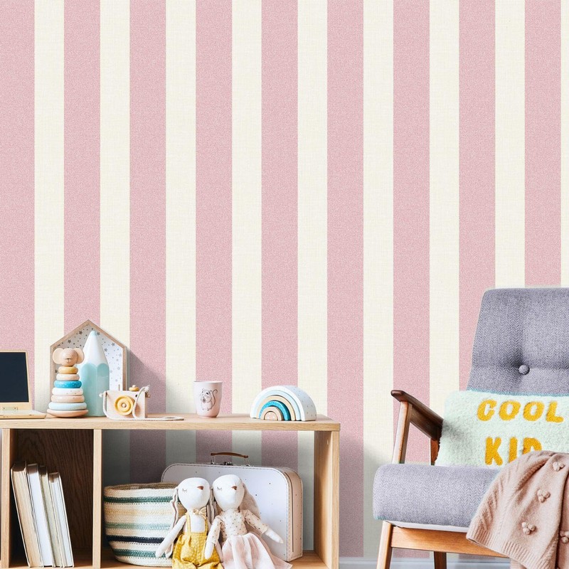 - Subtle Textured Surface – Both the pink and cream stripes feature a subtle yet discernible texture, mimicking the refined look and feel of woven fabric or natural linen. This delicate tactile element adds depth and sophistication to the wallpaper, preventing a flat appearance and enhancing its overall visual interest.