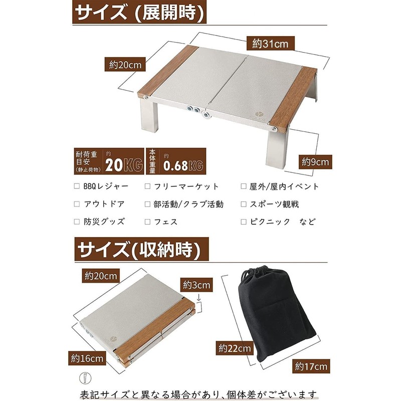 - 【STURDY CONSTRUCTION, PRACTICAL AND CONVENIENT】 The center hinges and sturdy construction ensures an incredible 44.1 lb (20 kg) load capacity. The legs have a one-touch opening and closing, and when stored, the legs are folded under the top plate for easy one-touch opening and closing, and the integrated piece provides stability. Folds up compactly. After folding, it will be about half the size when unfolded. It will not become baggage when placed in the storage