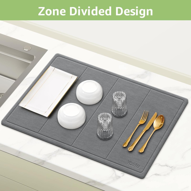 - WATER-GUIDING GROOVES & ZONE-DIVIDED DESIGN: Our drying stone for kitchen counter has a grooved edge which is designed to direct and trap water from running onto the countertop. And this dish drying stone has four areas that separated by grooves, which allow for tableware to be arranged by categories and help to create a tidy and organized kitchen area