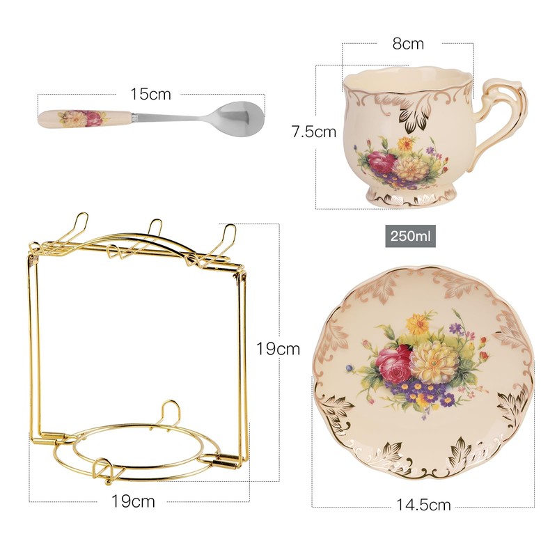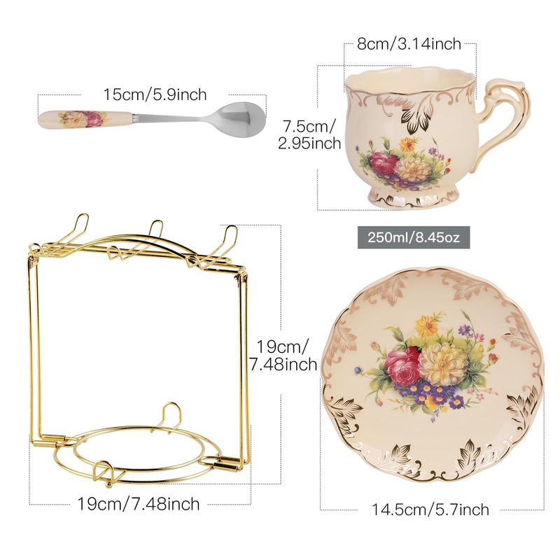 - Comfortable size and capacity: Tea Cup 8 ounce in capacity. Saucer 5.7inch in diameter. Spoon 5.9inch in length