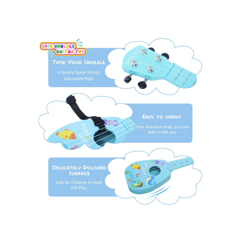 Ukulele is a great way to take laid-back tropical atmospheres anywhere, whether you're strumming in a hammock on the beach or kicked back in a recliner in your living room, a ukulele is a great way to spread some good vibrations. Our toy Ukulele can stimulate children through every stage of development and help cultivate their sense of music, learn basic notes and rhythmic patterns, and put on show for their favorite audience--you, of course.