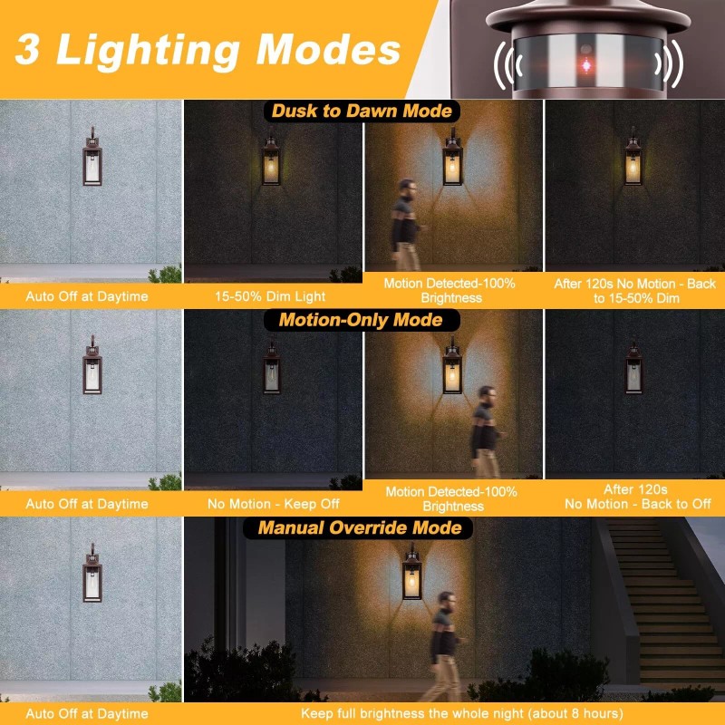 - Motion Activated & Dusk to Dawn Sensor: Our motion sensor outdoor light has 3 lighting modes: 1. Dusk-to-Dawn MODE: With 15-50% adjustable dim light at night, activated with 100% light once motion detected, revert to dim light after 120s without movement; 2. Motion-Only MODE: Keep off at night, 100% light once motion detected, revert to full off brightness without movement; 3. Manual Override MODE: Keep full brightness whole night. Light will automatically turn off during the dawn in each mode.