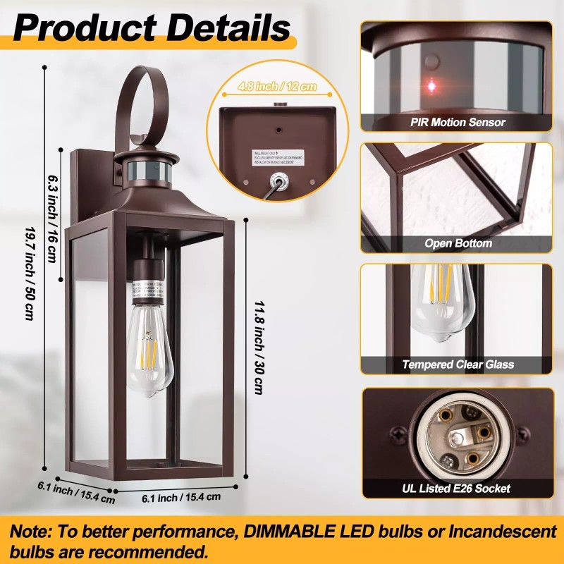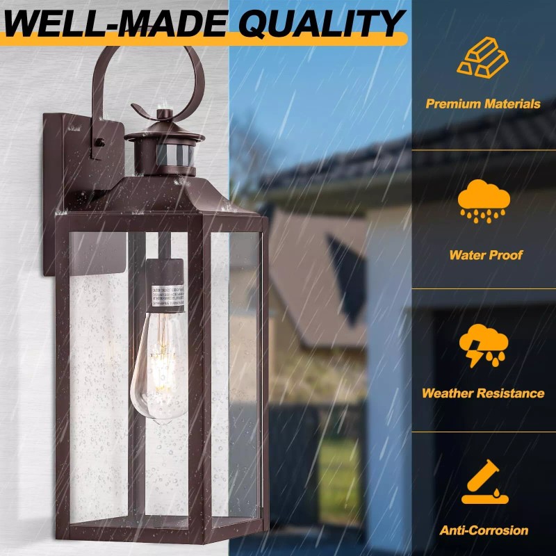 - Waterproof & Weather Resistance: The oil rubbed bronze dusk to dawn motion sensor wall light is crafted from premium metal, and will not get rusty or corrosive for years of use. It boasts excellent performance in weather resistance, with an IP65 waterproof rating, the extra large outside porch wall light for house can withstand all kinds of bad weather conditions. Even under rain, snow, or ultra-high or low temperatures, you can trust the outdoor wall lantern to keep new.
