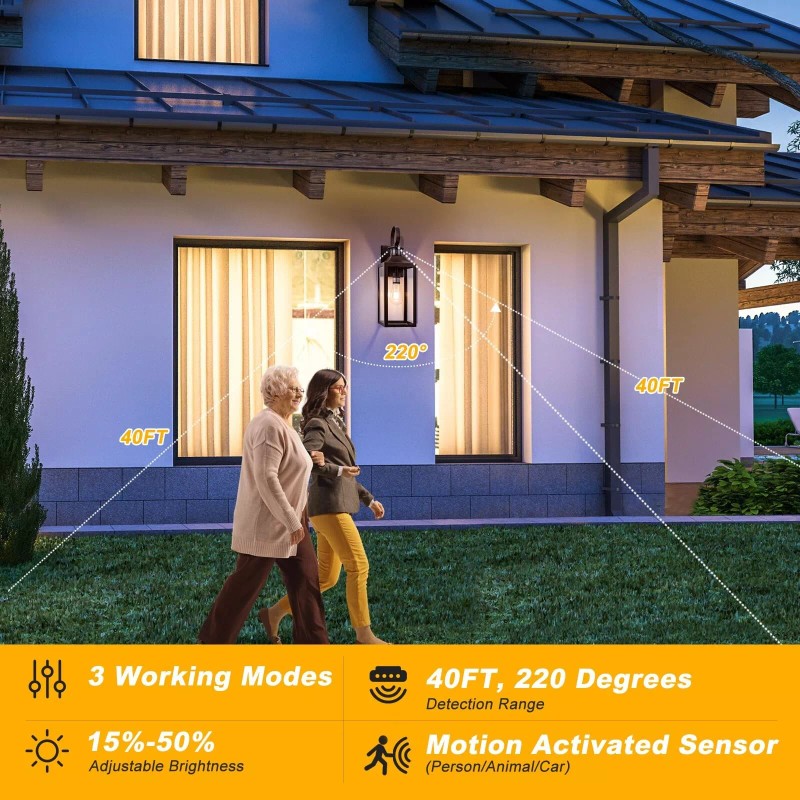 - Extra-Wide Detection Range: Our dusk to dawn outdoor lighting can work intelligently by sensitively sensing ultra-wide motion within 40 feet and 220 degrees. It is more sensitive and has a longer detection range than regular motion sensor porch lights. Additionally, our advanced motion activated wall mounted lights will not trigger motion detection when the wind blows through trees or the rain falls. The light fixture will only change lighting status when people, animals, or cars pass by.
