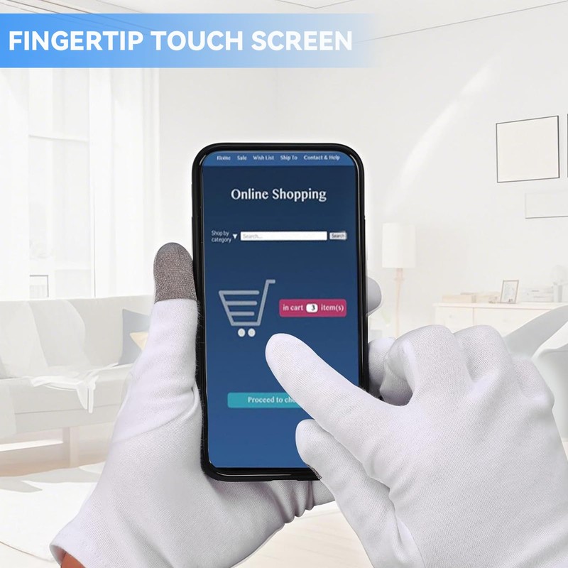 3. Dieses baumwollhandschuhe verfügt über eine speziell entwickelte Zwei-Finger-Touchscreen-Funktion. Die Fingerspitzen von Zeigefinger und Daumen bestehen aus einem speziellen leitfähigen Material, das das Bildschirmsignal präzise erfassen kann, sodass Sie verschiedene Touchscreen-Geräte problemlos bedienen können, ohne die Handschuhe ausziehen zu müssen. Bei kaltem Wetter oder wenn die Bedienung mit bloßen Händen unbequem ist, kommt unser baumwollhandschuhe weiß problemlos damit zurecht.