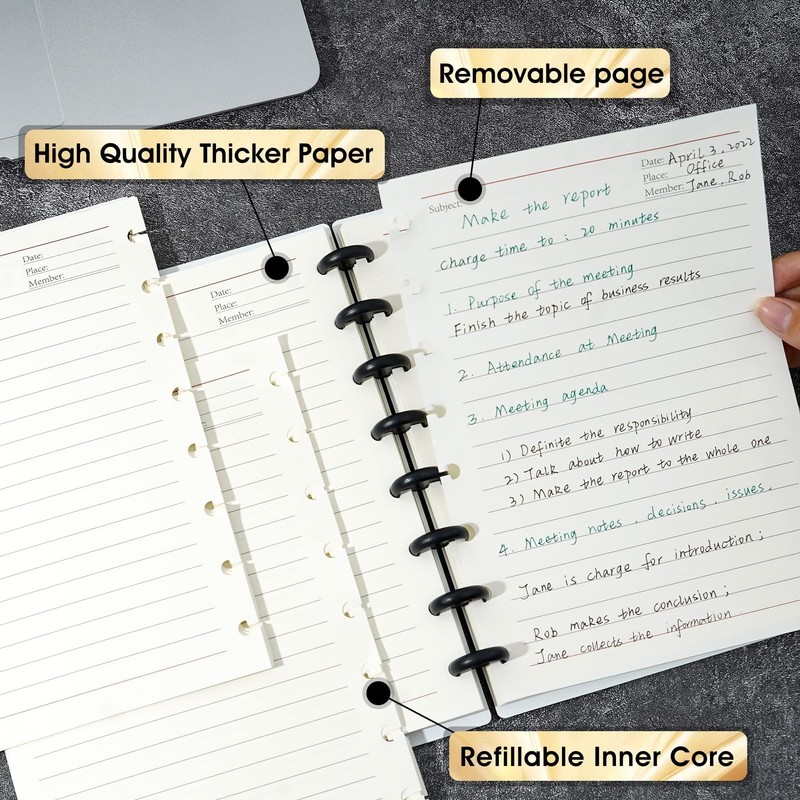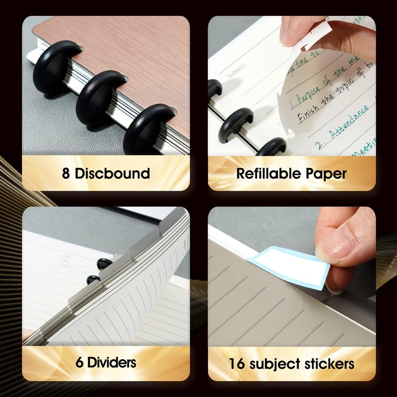- 【CUSTOMIZABLE DESIGN】Discbound notebook is an alternative to bulky 3 - or 6-ring binders with black plastic discs for easy addition, removal, and rearrangement of pages, providing unlimited DIY possibilities. Compared with the ordinary spiral journal, the discs saves space, does not affect the feel of use, easy to turn pages.