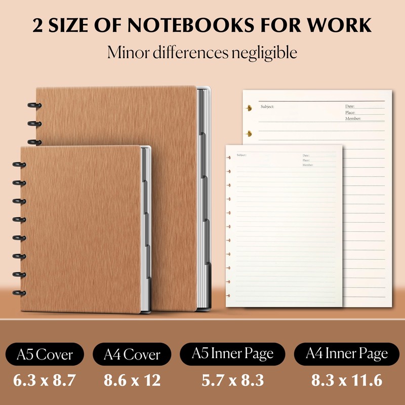 - 【DETAILS 】120 pages of high quality lined paper ensures smooth writing and long-term storage. 6 dividers,16 tab stickers, 8 1-inch discs (holds about 150 sheets of paper). 100GSM environmental protection thick paper, can prevent ink bleeding, create a clean writing space. The size of the cover and the inner pages are different, 6.3" x 8.7 " stiff cover(Surface can be a little rough), great for walking around and writing at the same time, 5.7" x 8.3" inner pages.
