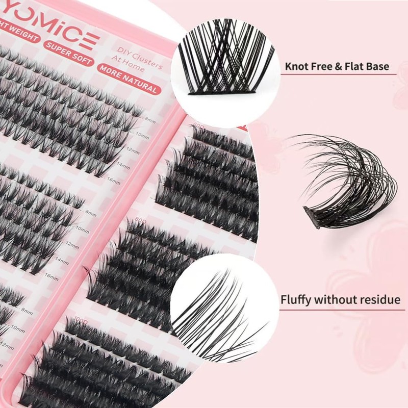 - 💖【600pcs Cluster lash book】Yomice DIY fluffy lash clusters pack includes thick and volume eyelash clusters in different densities: 30,40,50,60D, 80D, and 100D, with lengths ranging from 8mm to 16mm.You can change your eyelash look anytime, anywhere. One lash tray is enough for you to use many times.