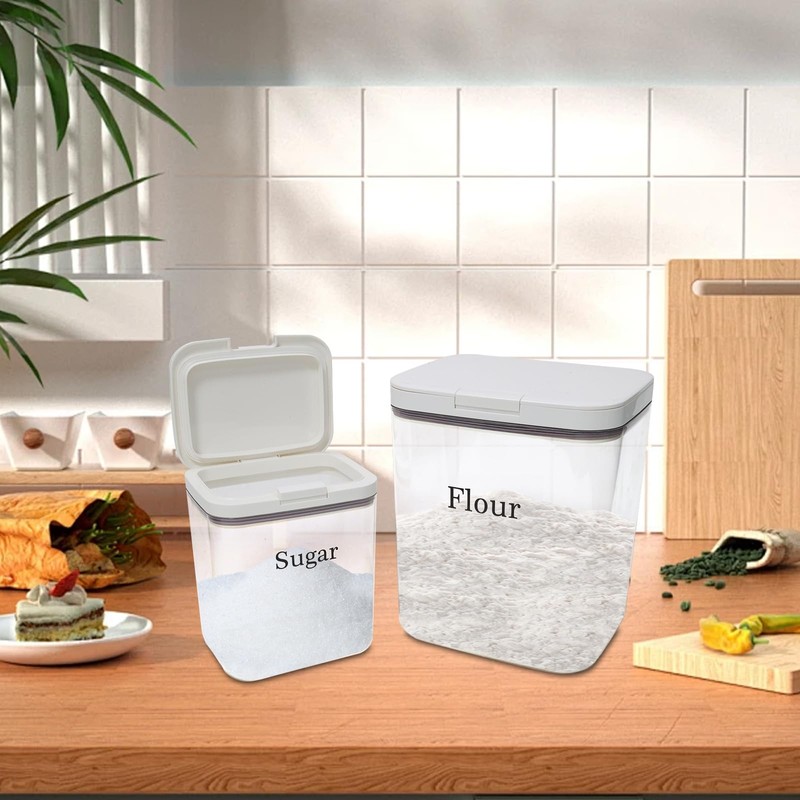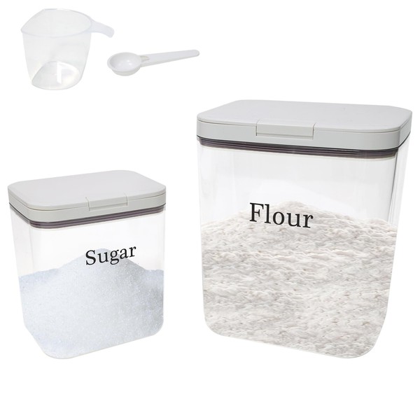- SUPERSIZE STORAGE :Includes 2 Extra Large 5.5L/2L flour sugar storage containers with airtight lids. These rice container measures size are 8.07 x 6.54x 9.65 inches and 5.9 x 4.7x 6.7 inches provides ample space for flour, sugar, rice, grains, beans, cereal, pasta, coffee and more. This set comes with one sooup. Great for pantry storage containers.