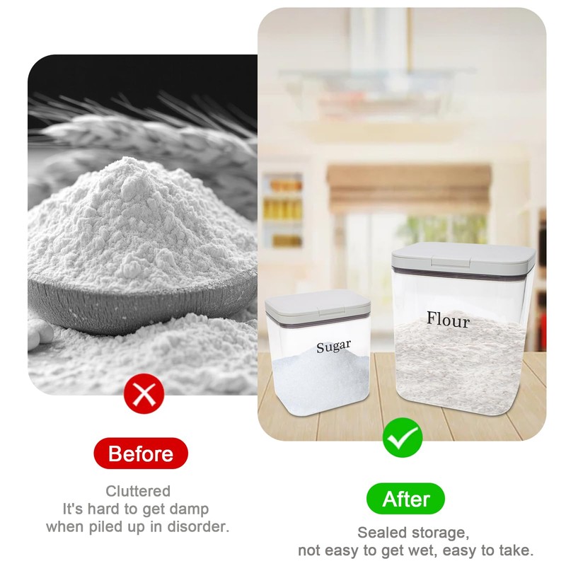 MULTI-USE:Our cereal storage containers are ideal for storing dry food like flour, sugar baking supplies, bulk food like spaghetti, pasta, oats, rice, cereal, nuts, corn, chips, snacks, coffee, tea, beans.Flour dispenser will organize food by categories, which are your efficient helper for kitchen and pantry organization.