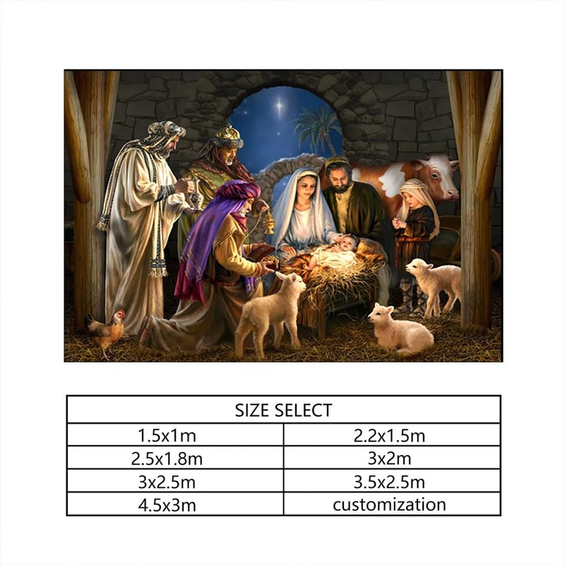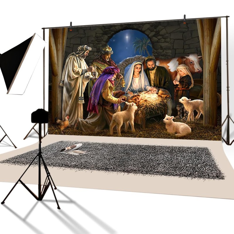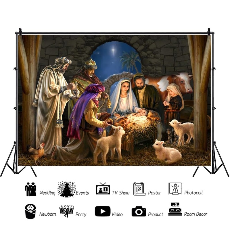 YongFoto 8x6ft Nativity Scene Backdrop Christmas Photo Backdrop Jesus Nativity Christ Manger Sheep Birth Of Jesus Background Photo Studio for Holy Communion Party Decor Banner Photo Studio Props