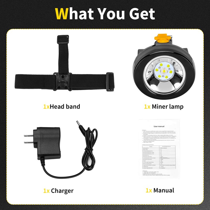 - ➤ What You Will Get? 1* Mining headlamp (2 batteries required&included). 1* Head band. 1* Battery charger. 1* Retail package.