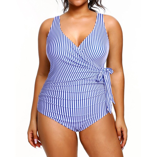 - Plus Size Tummy Control Bathing Suits: The plus size swimsuit, with its V-neck and U-shaped back design, can perfectly showcase your curves. This wrap one piece swimsuit features a side-tie design.