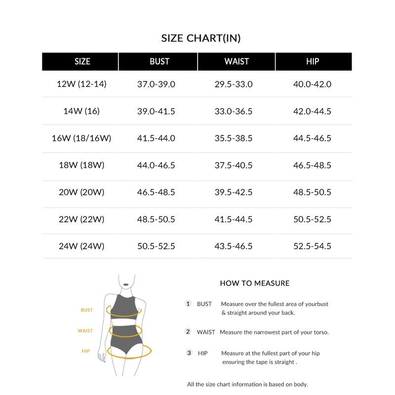 12Plus(US 12W): Bust 38.5-40, Waist 30.5-32, Hip 41-42.5