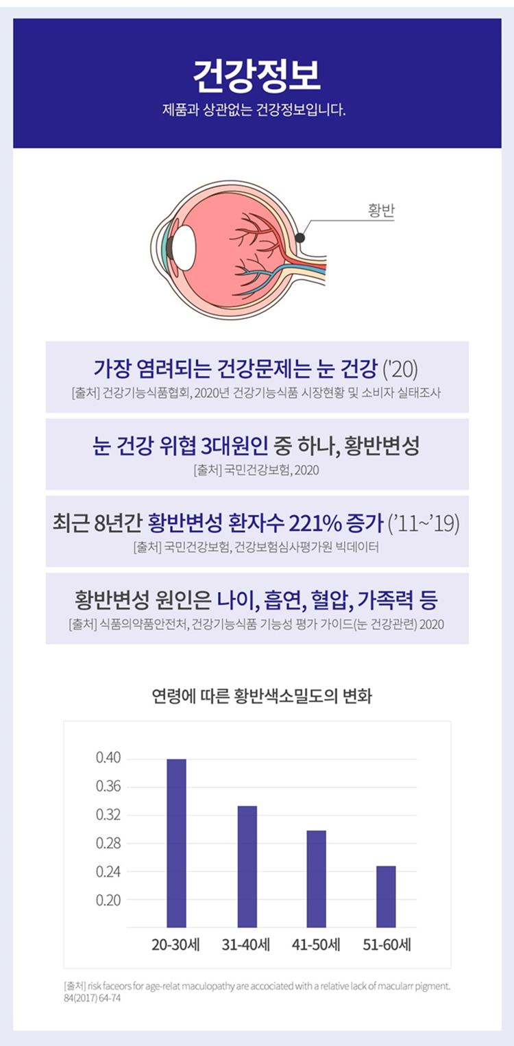 - Name and content of raw materials: Marigold flower extract (marigold flower extract, sunflower oil, dl-α-tocopherol), vitamin C, d-α-tocopherol, zinc oxide, retinyl palmitate mixed preparation (oil-based vitamin A Fatty acid ester, peanut oil, vitamin E), vitamin B6 hydrochloride, vitamin B1 hydrochloride, vitamin B2, vitamin D3 mixed preparation (vitamin D3, processed oil, dl-α-tocopherol), soybean oil (soybean oil, silicon resin), beeswax, soybean Lecithin, Haematococcus extract, beta-carotene mixture (modified specialty, β-carotene, sunflower oil, sucrose, L-sodium ascorbate, vitamin C, vitamin E, silicon dioxide), berry mixed concentrate powder, Cassia chinensis extract powder , Vitamin mineral mixed preparation [tricalcium phosphate, vitamin C, vitamin E, mixed preparation powder (dl-α-tocopheryl acetate, modified starch, glucose syrup powder, silicon dioxide), ferrous fumarate, nicotinic acid amide, powdered vitamin A mixed preparation. (Glucose syrup powder, gum Arabic, corn starch, vitamin A acetate, dl-α-tocopherol), zinc oxide, vitamin B6 hydrochloride, vitamin B2, vitamin B1 hydrochloride, folic acid] Calories 0kcal, carbohydrates 0g (0%), protein 0g (0%), fat 0g (0%), sodium 0mg (0%), vitamin A 210μgRE (30%), vitamin D 3μg (30%), vitamin E 3.3mgα-TE (30%), vitamin B1 0.36mg (30%), Vitamin B2 0.42mg (30%), Vitamin B6 0.45mg (30%), Vitamin C 30mg (30%), Zinc 2.55mg (30%), Lutein 20mg