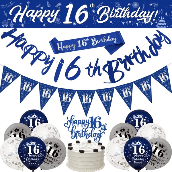 - Happy 16th Birthday Decorations--This reusable 17 pieces birthday party set contains a 9ft banner, a birthday sash, a birthday bunting, a birthday cake topper, a birthday triangular flag,4 navy blue balloons,4 metallic silver balloons and 4 silver foil confetti latex balloons,perfect for your loved one's 16th birthday decorations.