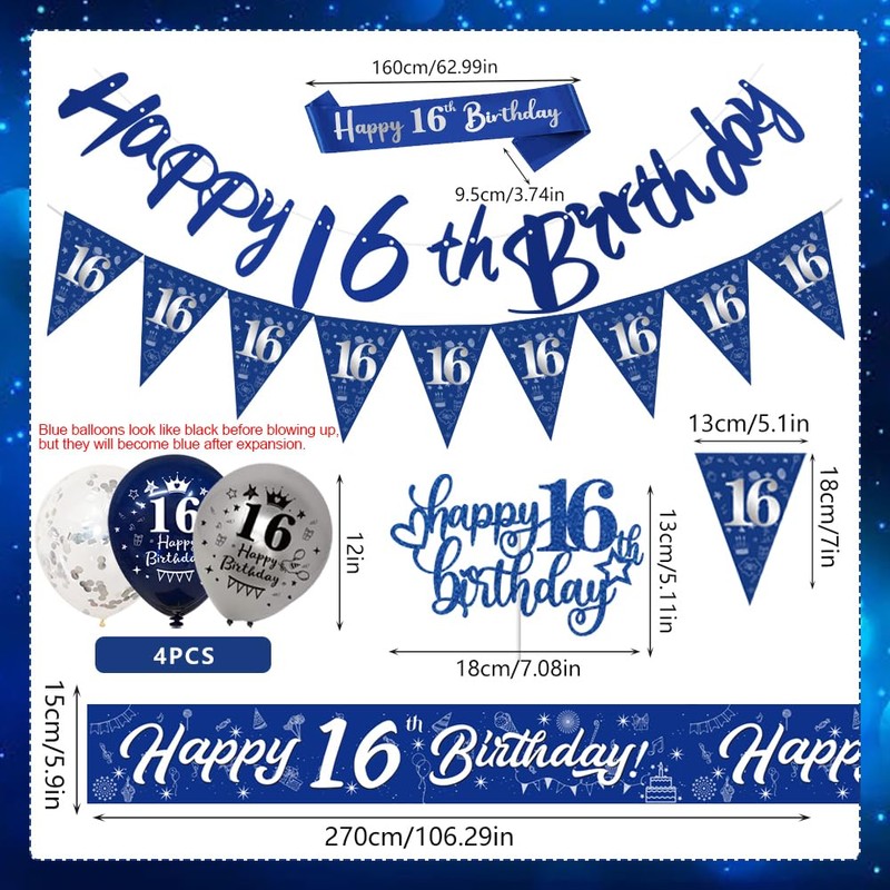 Product descriptionHappy 16th Birthday DecorationsThe birthday decoration with silver blue as the theme color whichcreates a warm and happy atmosphere for your 16th birthday.Package list:1x 9ft banner1x birthday bunting1x triangular bunting1x birthday sash1x birthday cake topper4x confetti latex balloons4x navy blue balloons4x sliver boons.When you receive the blue balloon, it looks like black before it blows up, but after you blow it up, it turns blue. So you don't have to worry about receiving the wrong balloon, just blow it up and it will turn blue.Safety WarningNot suitable for children under 8 years. For use under adult supervision