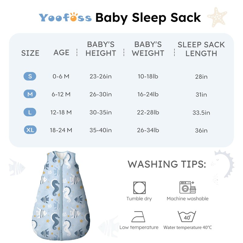 - 2-Way Zipper and Available Sizes: The top-grade double zipper allows unzip from the bottom for fuss-free diaper changes without disturb baby during the night, and design with zipper garage to protect baby's face from chafing. There are 4 available sizes for this baby sleep sack; S for 0-6 Months. M for 6-12 Months. L for 12-18 Months. XL for 18-24 Months.