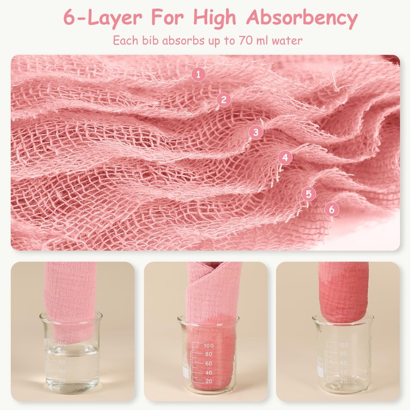 - Super Absorbent : 6 layers of thickened muslin bibs have super absorbency. Each muslin baby bibs can absorb 70ML of clean water. Even if your baby is a heavy drooler, it can be completely absorbed by these bibs, keeping your baby's clothes dry all day long.