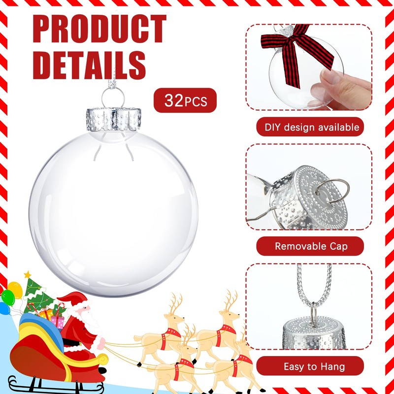 - DIY design as you like: you can fill the Christmas transparent balls with different kinds of things, such as shredded paper, candy, ribbons, fake snowflakes, glitter, and you can also paint on it to create some nice holiday decorations