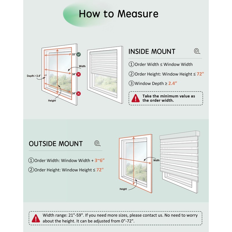 - 【Selection Size Guide】1.Inside Mount: Window frame must be at least 2.4" deep. The shade width should be 0" to 0.1" narrower than the window width. Note that motorized shades will have small light gaps on both sides. For full blackout, we recommend opting for an outside mount; 2.Outside Mount: The shade should be 3" to 6" wider than window frame for better coverage. (Please carefully read and adhere to the specific measurement instructions provided for FBA motorized blinds.)