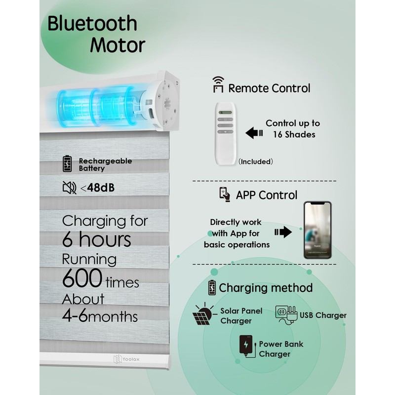- 【Rechargeable Battery Motor】With Bluetooth motor, motorized zebra blinds with remote can be seamlessly controlled via the Yoolax Home App without needing a Smart Bridge. For integration with Alexa, Google Assistant, and more, a Bluetooth Hub/Bridge is required. Featuring a built-in rechargeable battery, our remote window shades can be used for 4-6 months once fully charged. Pair them with our solar panel for an eco-friendly power solution that's as smart as it is efficient