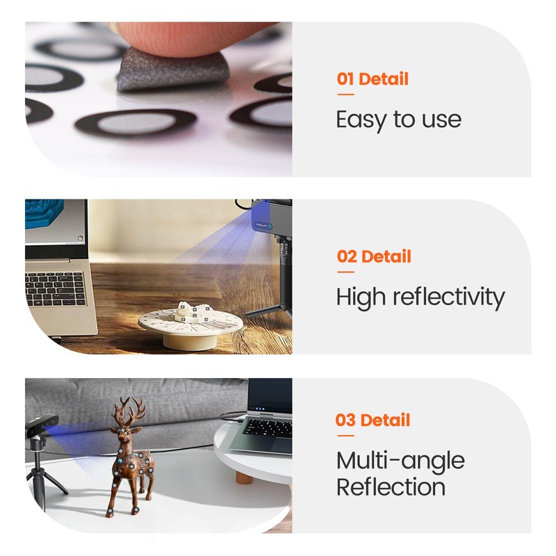 • 【High Reflectivity】: Provide a clear reference point, and can more accurately capture complex details, reduce the risk of data loss, especially in small or complex objects, capture more details throughout the scanning process, access to a more complete model
