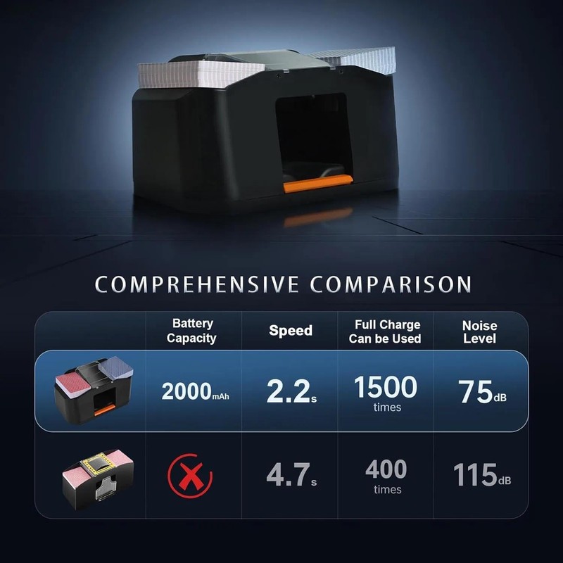 - 【 Equipped with High-Speed Silent Motor 】 The card shuffler can quickly and smoothly scramble the playing cards and collect them into the tray. After inserting the cards into the openings on both sides of the product, they will be automatically shuffled with a single push of the button and wait about 2 seconds. To better disrupt the order of the cards, it is recommended to shuffle more than 2 times.