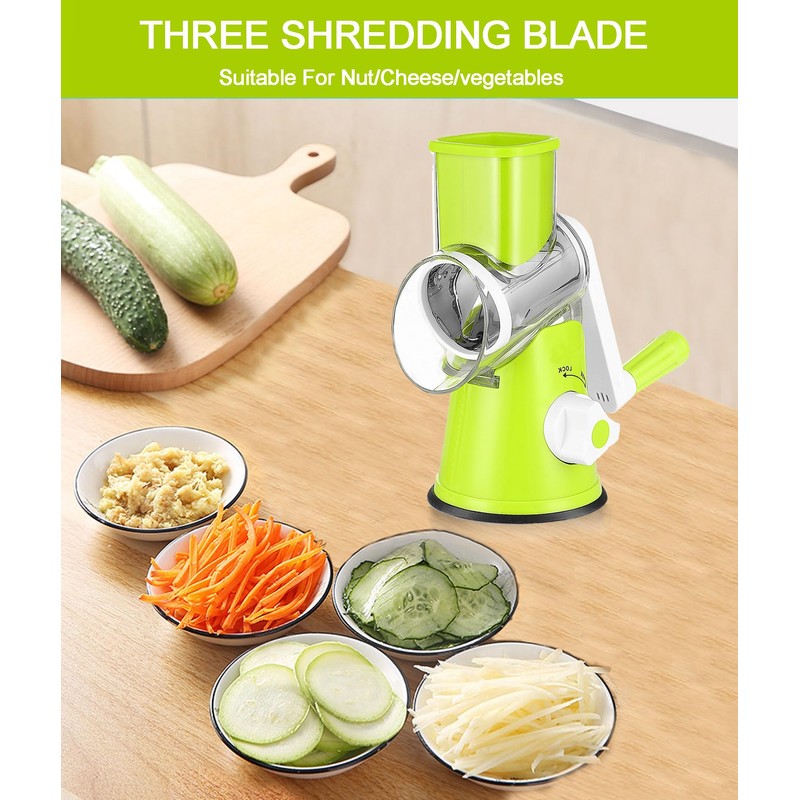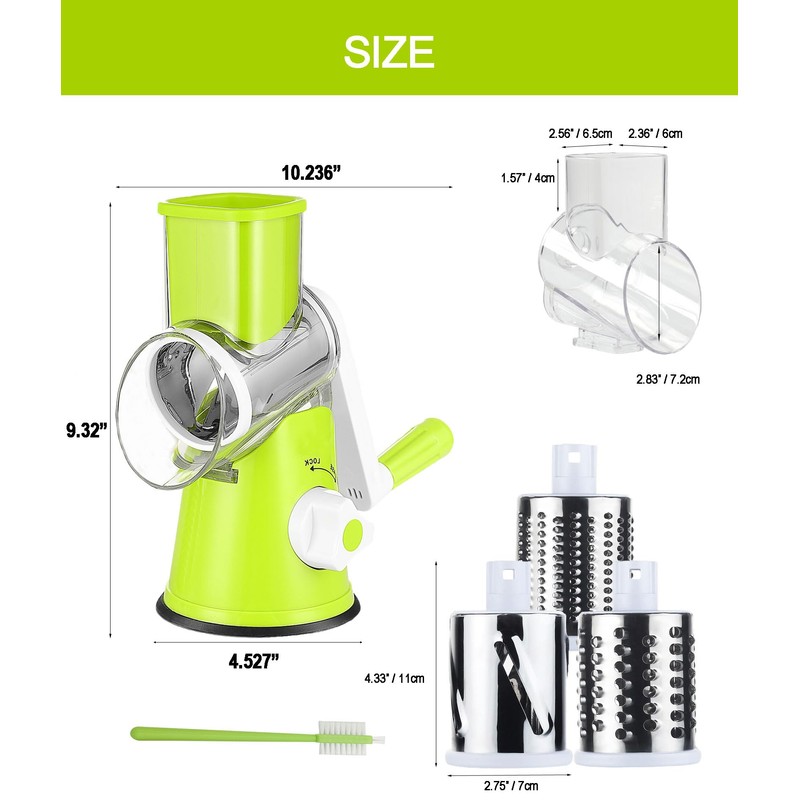 Yoozan Multifunctional Manual Vegetable Slicer, Rotary Cheese Grater with 3 Stainless Steel Blades and Cleaning Brush, Non-Slip Handle, Ideal for Vegetables, Fruits, and cheese - GREEN