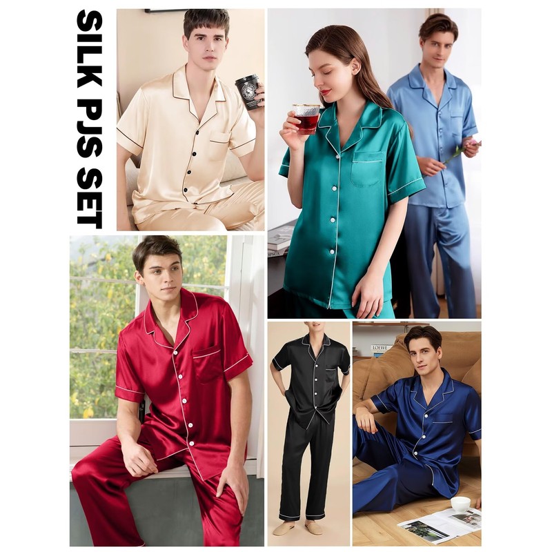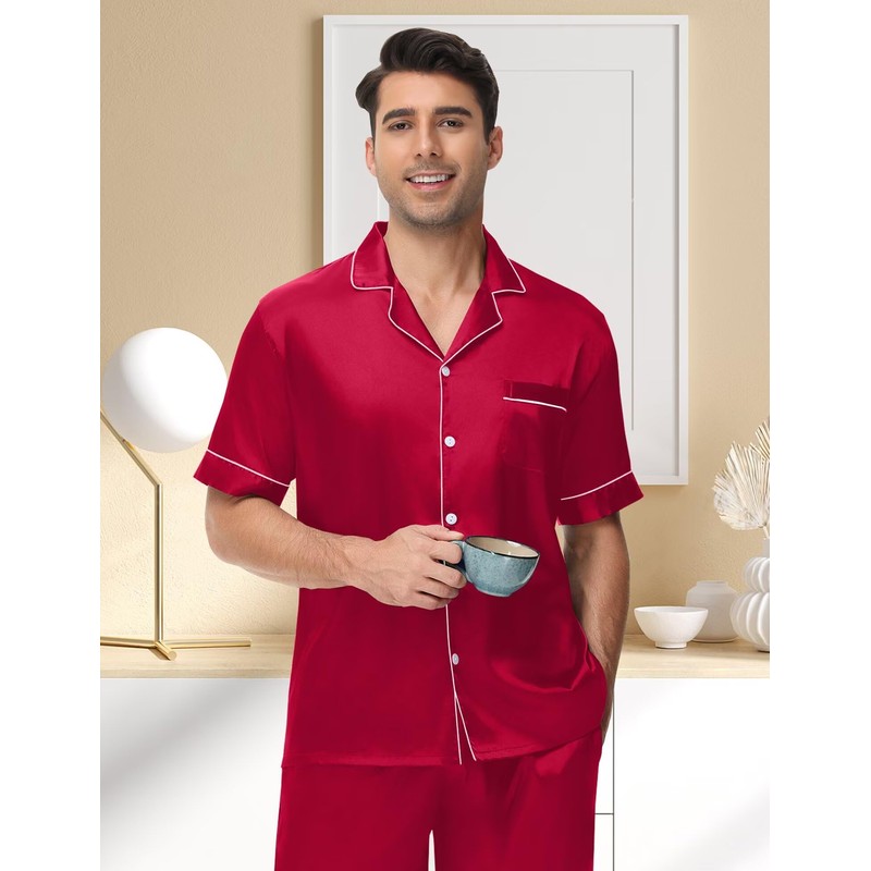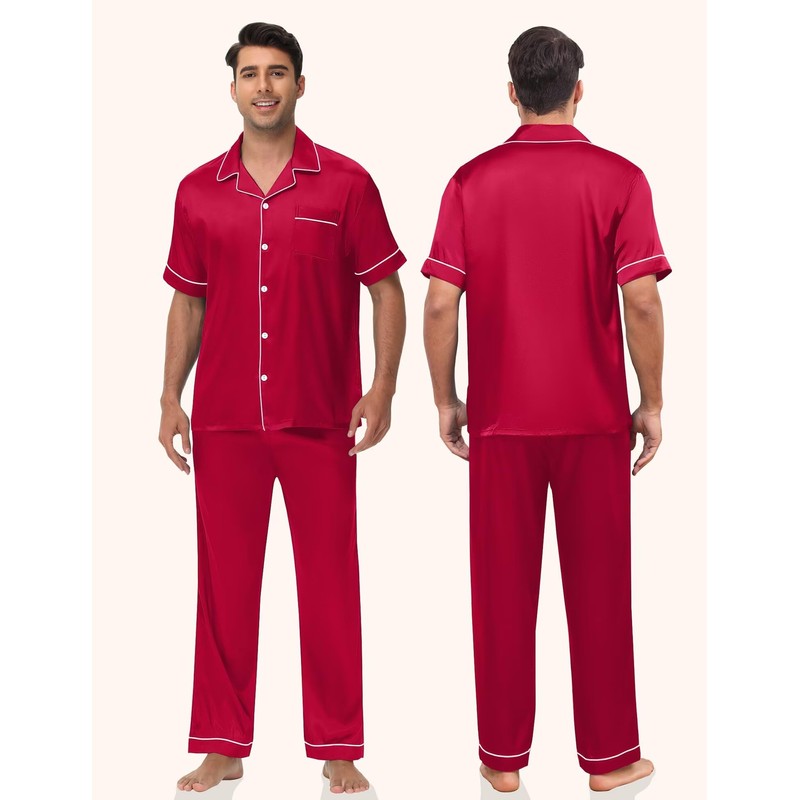 - Classic Short Sleeve Button Up Shirt: This men's satin pajamas set features an easy-wear button down shirt with notch collar and chest pocket. The relaxed fit and contrast piping add timeless style, while breathable fabric keeps you cool all night.