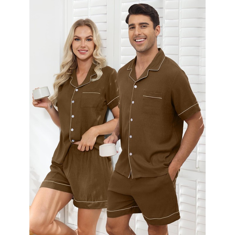• Stylish Button-Up Top: Elevate your couple loungewear with a refined short-sleeve button-down shirt featuring a classic notch collar. The chest pocket adds utility, while button-up front allows effortless transition from sleepwear to a lightweight cover-up for morning errands or balcony coffee.