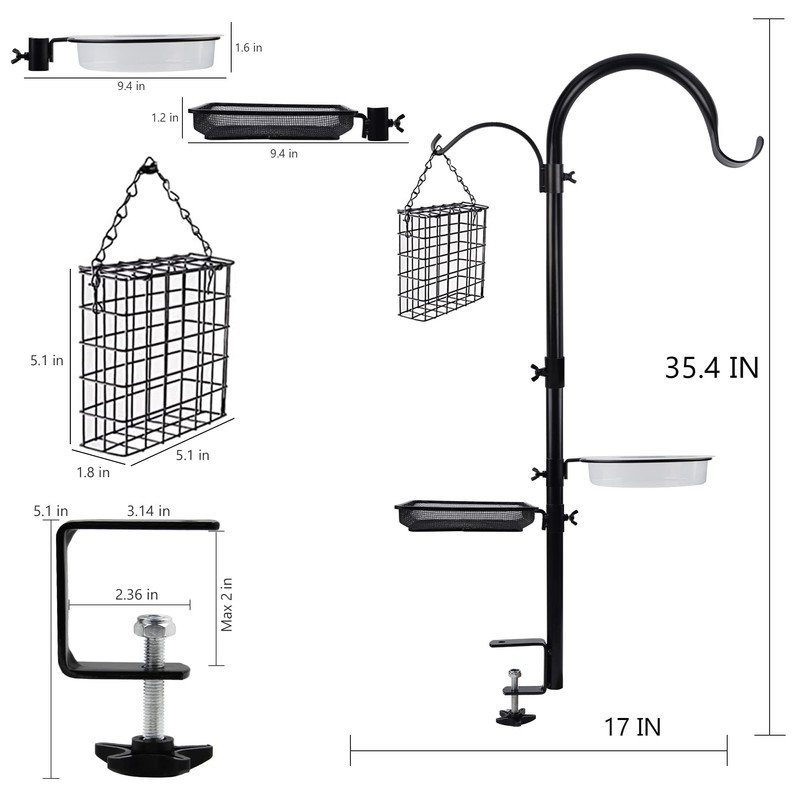 • DURABLE MATERIAL: The Bird Feeding Station Kit is made of heavy duty steel, durable weather-resistant black powder coated to prevent rust and long-lasting. A rust proof clamp with turning screw for securely mounting. Adjustable non-slip accommodates railings up to 2 inches thick. IF YOUR RAILINGS ARE MORE THAN 2 INCHES THICK, PLEASE DO NOT BUY IT.