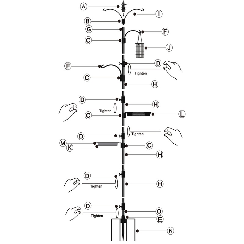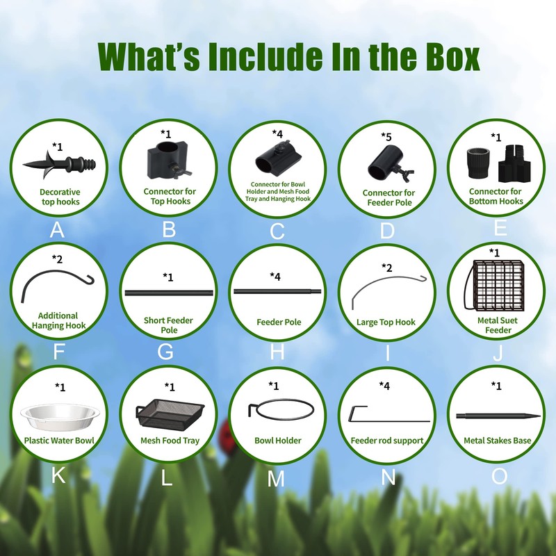 - Easy to Install: Need to assemble, please refer to the manual. Easily adjust components to any desired location by hand. No tools required! Forked metal stake base adds stability and permits easy placement. Large water dish & seed tray are easy to fill and clean.
