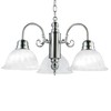 The Manzanita chandelier collection, by Yosemite Home Decor, embodies the aesthetic features of contemporary artistry. This model's Satin Nickel frame and Frosted Marble glass blend in very well with contemporary architectural design, while its three 60-watt incandescent lights easily provide crisp, clean illumination to a small room, or a nook, or over the dining room table. UL-approved, you can rest assured this model is safe for use in your home. With its one-year warranty, we have this product covered during the first year. Each sale comes with about six feet of chain and eight feet of wire.