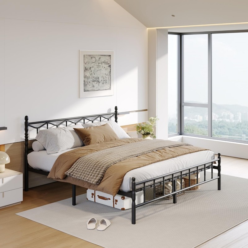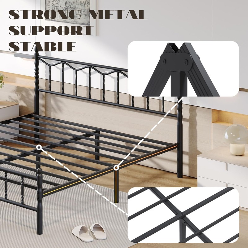 • Sturdy Metal Construction: Made of durable metal, the bed frame is heavy-duty and can support a king mattress without a box spring. It is built to handle the regular wear and tear of daily use, providing long-term stability.