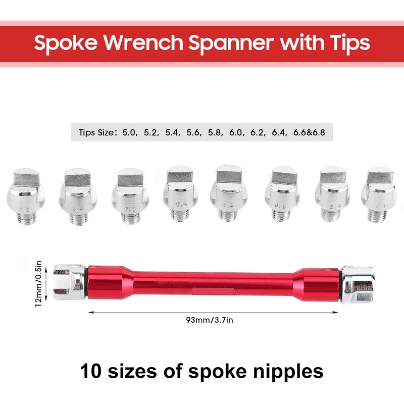 - Common Specifications: Spoke wrench bicycle is suitable for the most commonly used specifications: 5.0, 5.2, 5.4, 5.6, 5.8, 6.0, 6.2, 6.4, 6.6, and 6.8