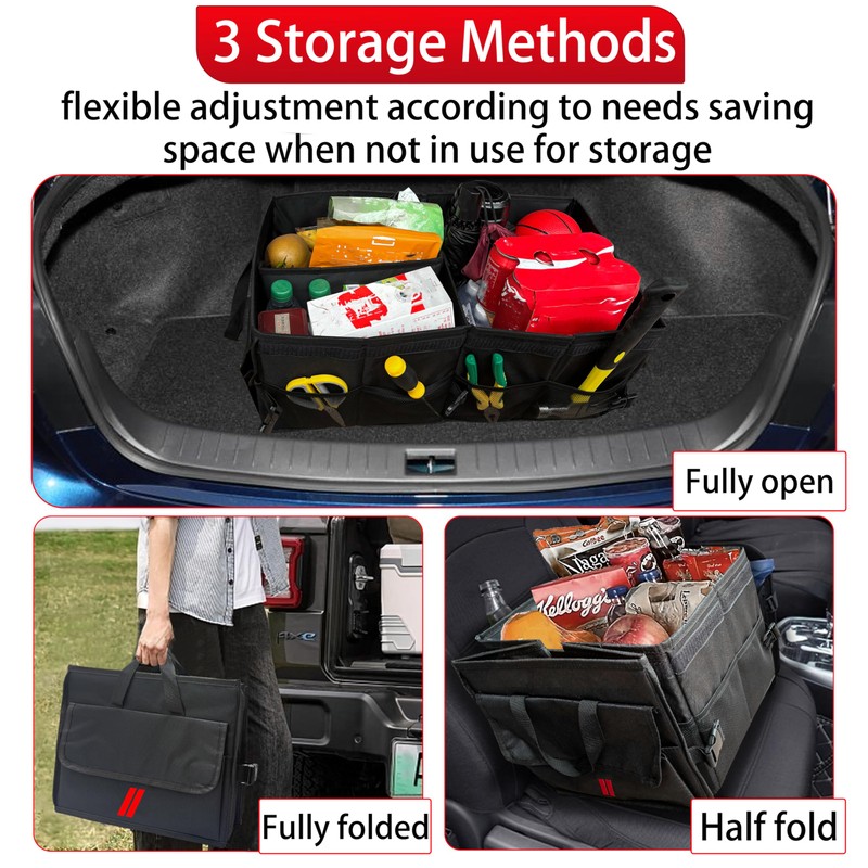 - Collapsible Storage Organizer: It is easy to install and collapse this storage organizer, adjustable side velcro strips allow you to fold the storgae organizer fully or halfway to fit your storage needs. You can put it in the trunk, rear seat or front seat. When not in use, simply fold it with the velcro strips.