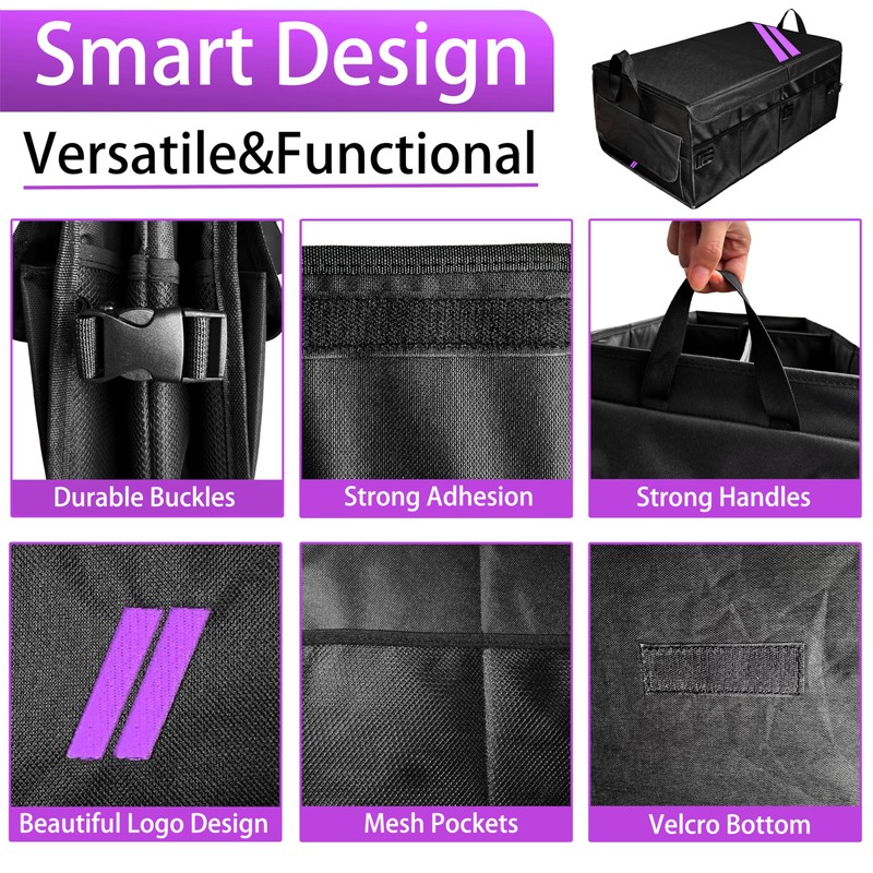 - Sturdy & Durable: Trunk organizer is crafted from durable Oxford Cloth, built in sturdy panel, rigid base plates to support each side panel, equipped with 2 compartments, 1 removable divider helps you organize differently sized items, 4 side mesh pockets, front and back pockets are designed to store smaller items.