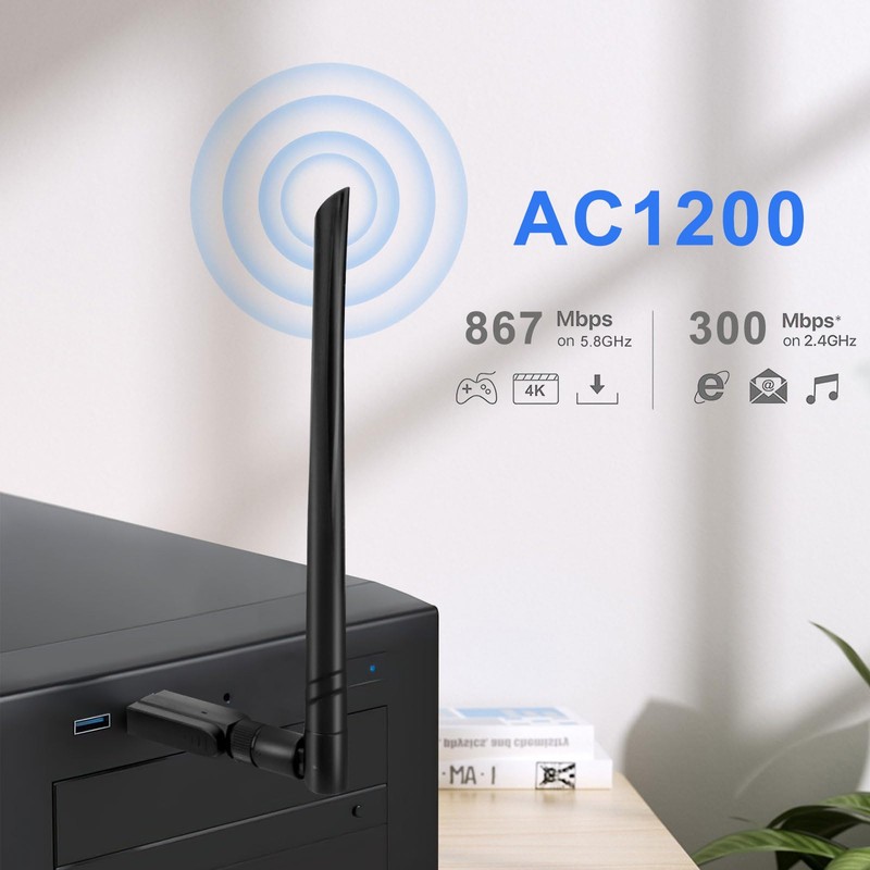 - ⚡ 【Adaptador WiFi USB a 1.200 Mbps】- Adaptador WiFi USB para PC con velocidades WiFi de hasta 1.200 Mbps en las bandas de 5,8ghz (867 Mbps) y 2,42ghz (300 Mbps) que reduce las congelaciones y los retrasos durante el streaming y los juegos. Es el compañero perfecto para jugar en línea, descargar y ver vídeo HD en streaming. Te ofrece una experiencia de alta velocidad y fluidez como nunca antes.
