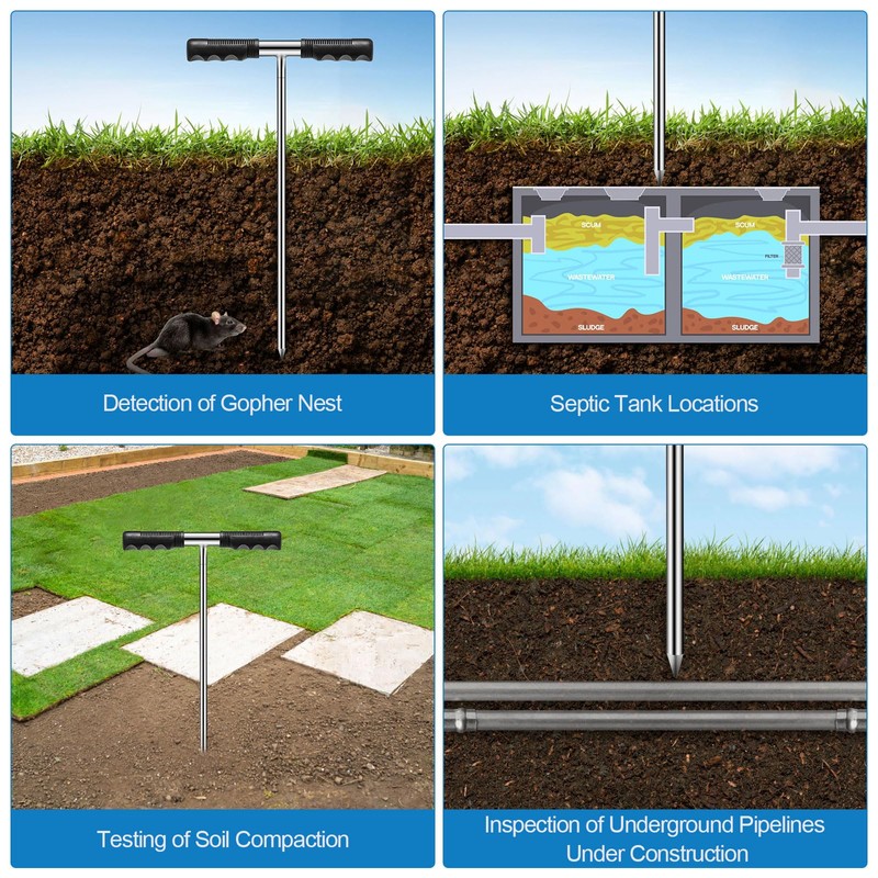 - Reliable Tool Soil Work: Look no further than the Yosuny ground probe with T-handle! This amazing ground probe tool has a smooth surface and is made with solid steel which is wear-resistant, rust-proof, and corrosion-resistant. The sturdy and slightly rounded tip makes it quick and simple to use within a safe range, you could even penetrate hard or frozen soil without any issues. Loving using this tool, which brings a convenient and efficient experience to work.