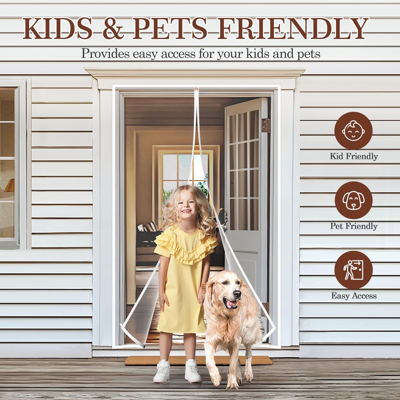 - CONVENIENT SCREEN DOOR SOLUTION - With this magnetic screen door, you can bring fresh air in to your home everyday, and still keep the obnoxious elements out! It is ultra durable and tear resistant so you can feel safe and secure with your kids walking through it. Plus, it is a pet friendly mesh screen that can withstand frequent use. It makes a thoughtful gift idea to pet parents who want a safe and affordable solution for easy pet entry indoors and outdoors