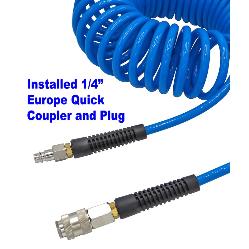 - COMES WITH QUICK CONNECT FITTINGS AND BEND RESTRICTORS: Installed 1/4" heavy duty europe quick coupler and plug for convenient to contact air compressor and air tools. Bend restrictors reduce kinking and help to increase the life of the hose. The quick coupler and plug CAN BE REMOVED by a wrench