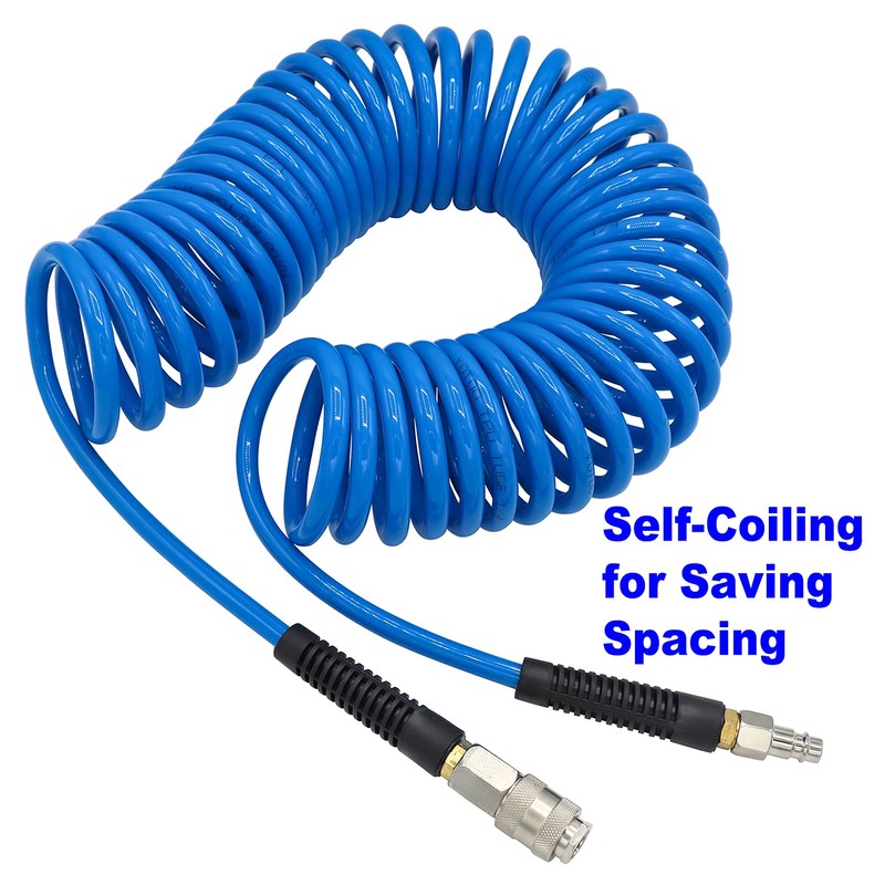 - 5 METER-SELF COILING: This recoil air hose is much more compact light weight. When not in use. The coiled hose will snap back automatively for saving spacing and easy storage. It delivers up to 150 PSI for maximum working pressure.