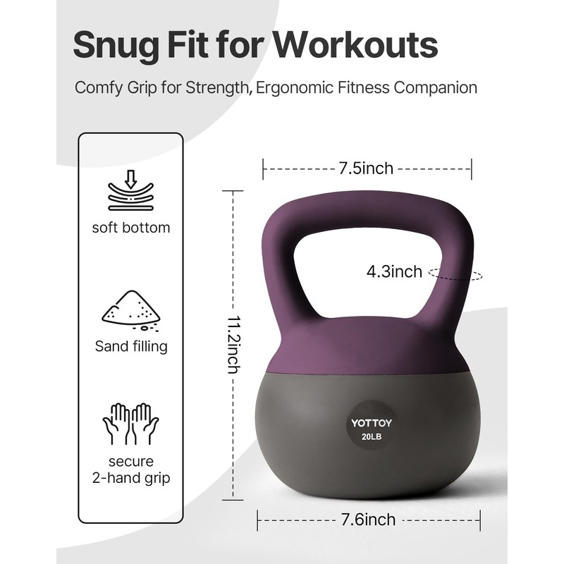 - 1.Shock-Absorbing Soft Kettlebell Base: Our YOTTOY soft kettlebell features a sand-filled base to reduce impact, protecting your floors while minimizing noise. This makes it an ideal choice for strength training kettlebells, ensuring a safe and comfortable workout experience