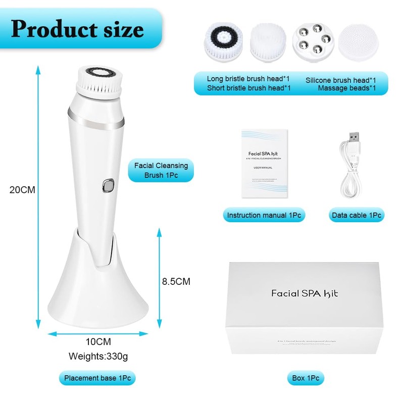 - 4-in-1 facial cleansing device: facial cleansing brush comes with 4 different brush heads, long hair brush head, short hair brush head, silicone brush head and massage beads. Suitable for all skin types: normal, oily, dry, combination skin and sensitive.