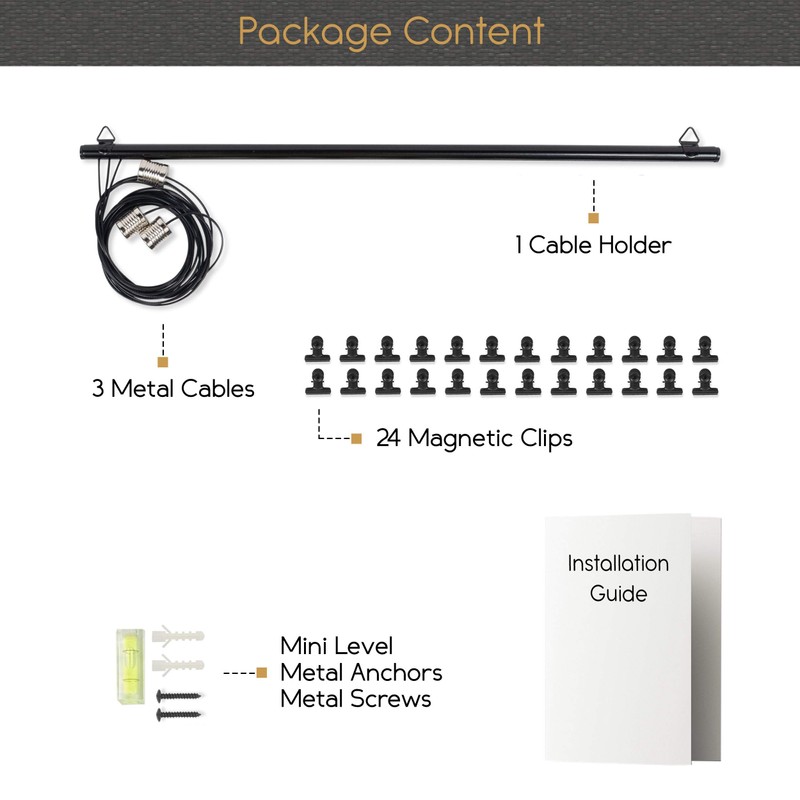 - Sturdy and Modern: This picture hanging kit comes with 3 metal wire rope and a wide cable along with 24 magnetic clips for photos. Besides being sturdy, its sleek and modern design will create a boho decor on your walls.