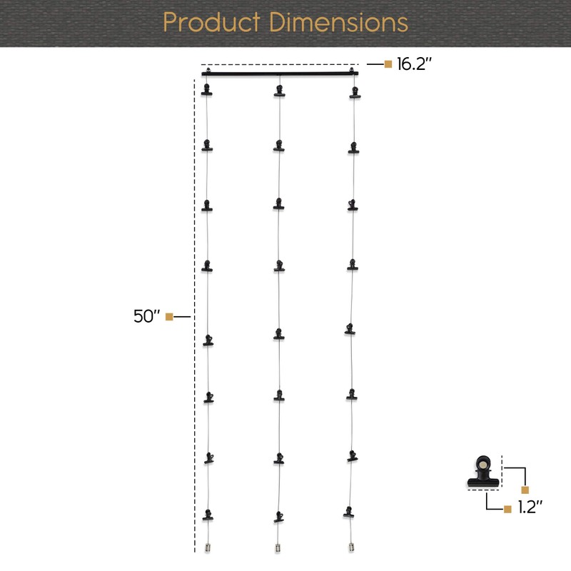 **Specifications:** **Material:** Metal **Color:** Black **Dimensions:** Rail W 16” Each Cable H 49” **What Comes With Your Order:** 1 Rail, 3 Cables, 24 Picture Hanging Clips, Mounting Hardware and Installation Hardware