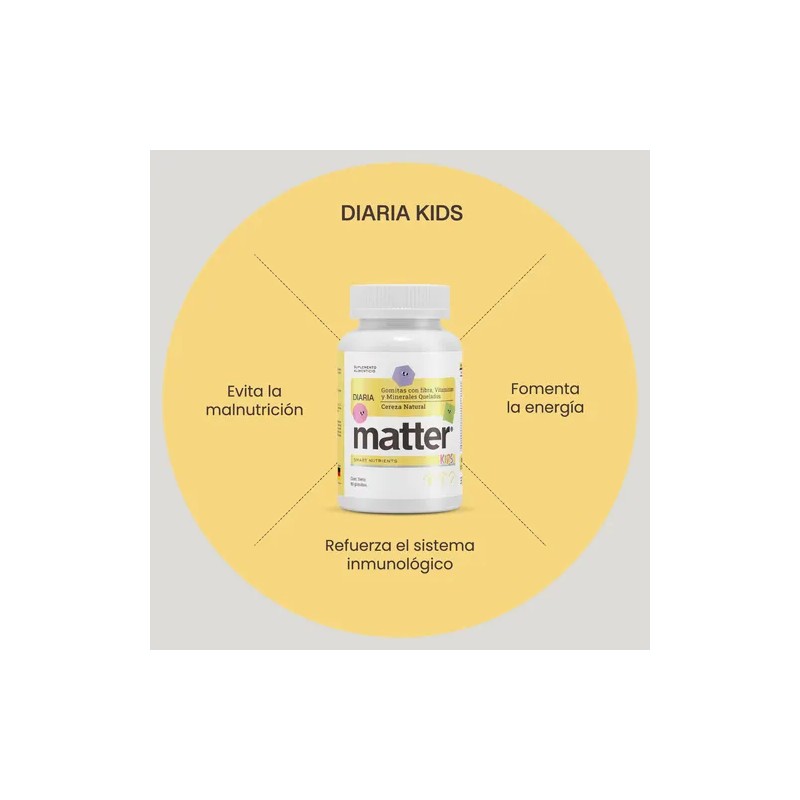 Descripción Limpia: Matter Smart Nutrients presenta, un multivitamínico diseñado pensando en los más pequeños, Diaria Kids, ofrece una manera divertida y práctica de incluir micronutrientes esenciales en la rutina diaria de los niños. Con gomitas en forma de corazón y un delicioso sabor natural a cereza, cada dosis se convierte en un momento agradable que puede complementar sus necesidades nutricionales.